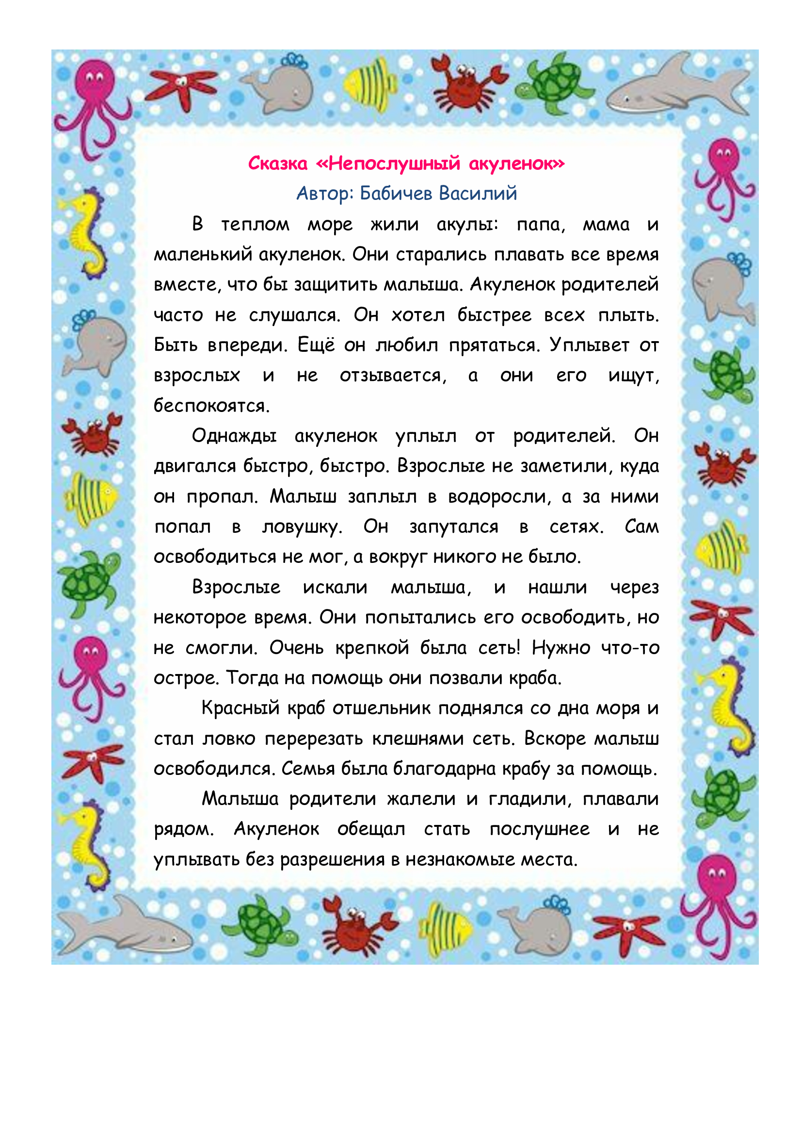 Сказка Бабичева Василия "Непослушный акуленок"