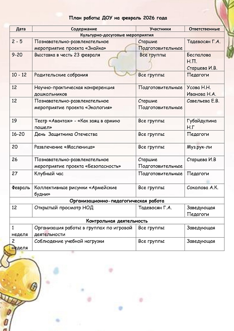 План работы ДОУ на февраль 2026 года Главная :: Наши события :: План работы ДОУ на февраль 2026 года 30.01.2026 Последниеновости 30.01.2026 План работы ДОУ на февраль 2026 года 26.01.2026 Проектная работа группы "Знайка" 26.01.2026 Проект "Безопасность - про "Зимние забавы" 15.01.2026 Проект "Экология" 05.01.2026 План работы ДОУ на январь 2026 года